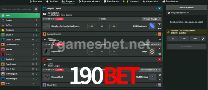 O 190Bet oferece uma grande seleção de opções de apostas em e-sports com probabilidades competitivas